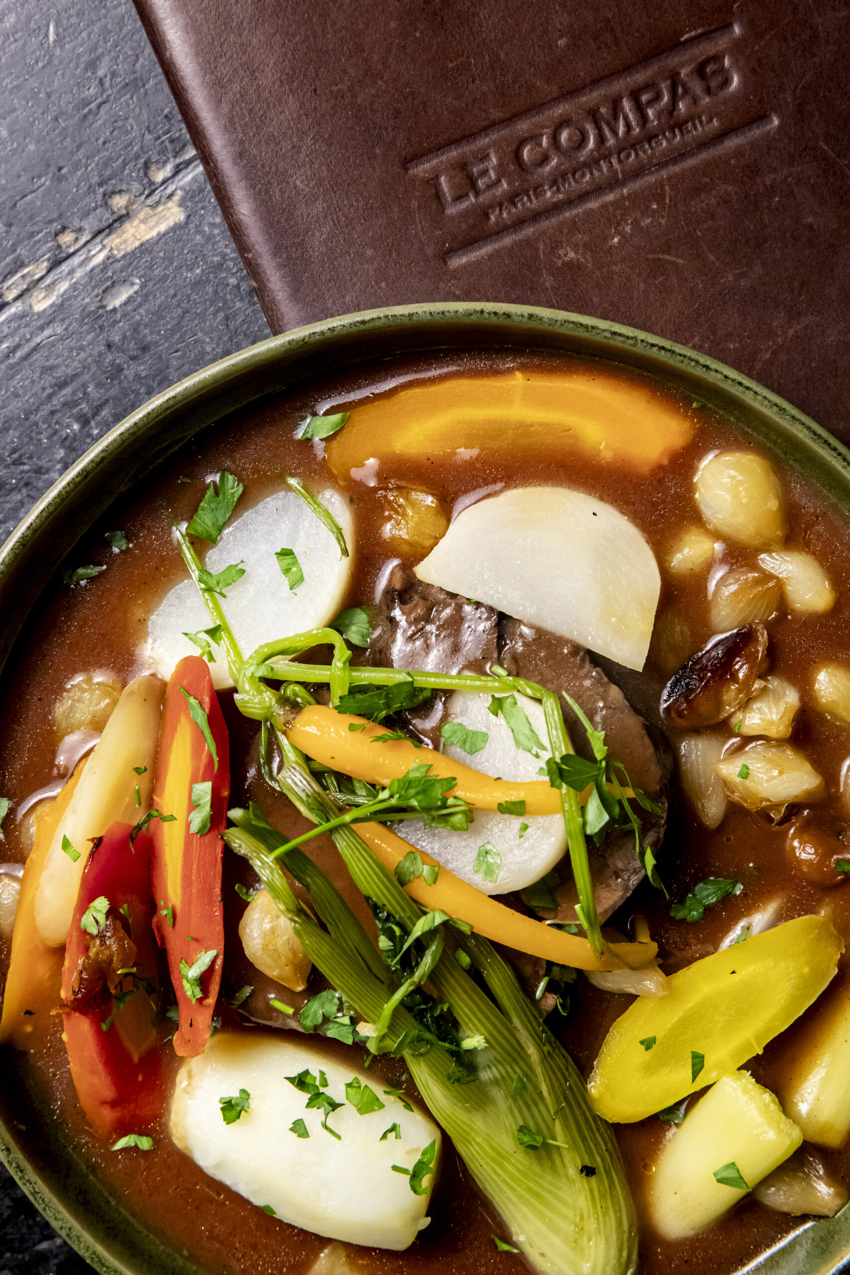 « C’est à deux pas, rue Montorgueil, au Compas d’Or » Il lui assura qu’elle pouvait être tranquille. (…) Ce fut comme un avant-goût de la campagne, en plein Paris. Derrière le restaurant Philippe, dont les boiseries dorées montent jusqu’au premier étage, se trouve une cour de ferme, noire et vivante, grasse de l’odeur de la paille fraîche …